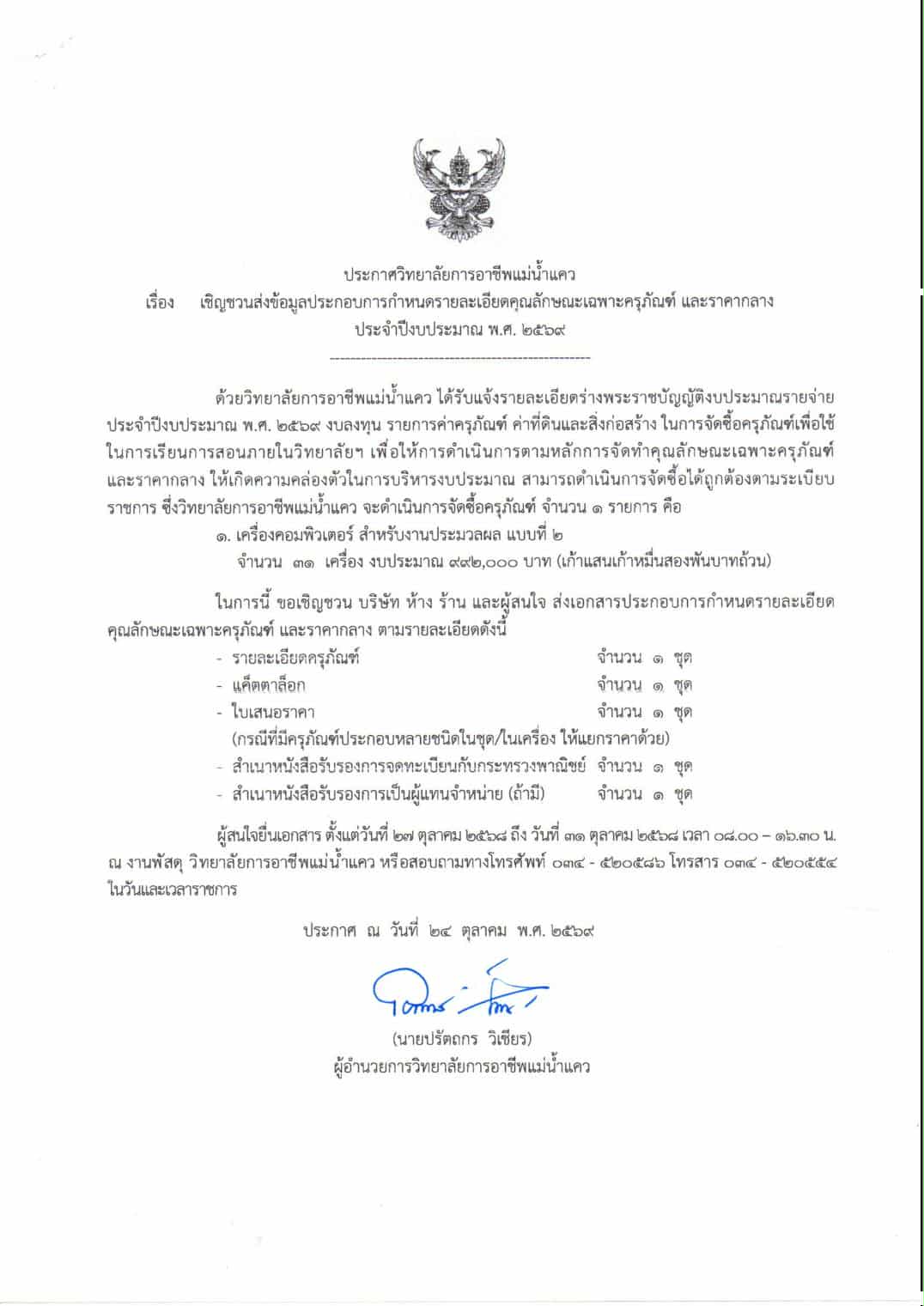 ประกาศวิทยาลัยการอาชีพแม่น้ำแคว เรื่อง เชิญชวนส่งข้อมูลประกอบการกำหนดรายละเอียดคุณลักษณะเฉพาะครุภัณฑ์ และราคากลาง ประจำปีงบประมาณ พ.ศ. 2569